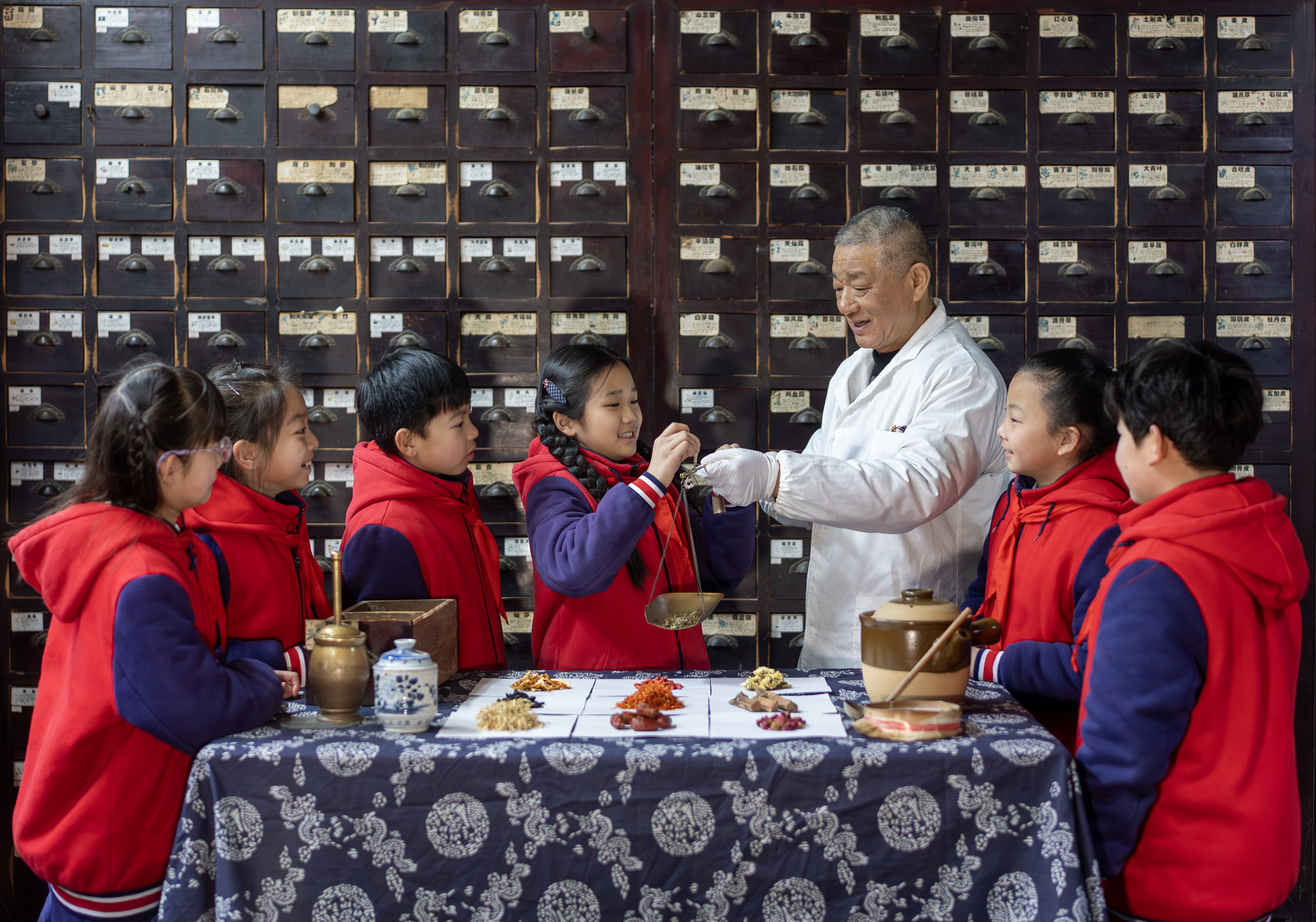 3月17日,在江苏省兴化市昭阳街道上池斋药店,兴化市景范学校学生在中药师的指导下体验抓中草药。