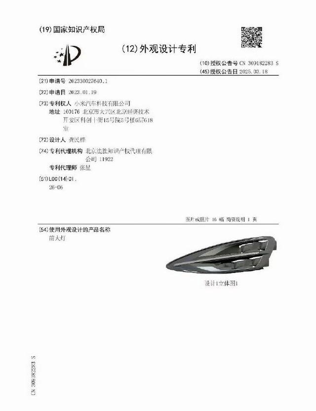值得关注的是,涉诉前大灯专利采用特殊“后授权”布局,2023年1月19日提交申请,直至2025年3月18日才获授权,审查周期超两年,远长于外观专利常规6至8个月的审查时限,属于典型“潜水艇专利”策略。专利授权两个月后,小米汽车申请专利权评价报告,国家知识产权局于2025年5月7日出具报告,确认该专利有效。