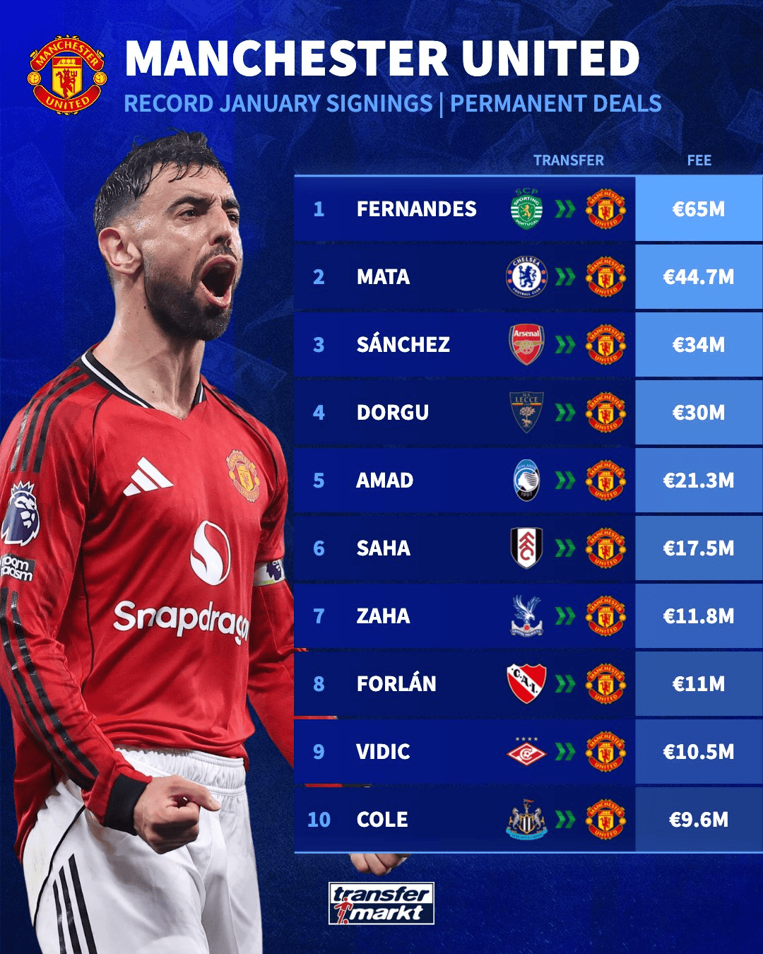 虎扑01月16日讯 冬窗正在开启中,德转发布榜单,统计曼联队史一月最贵的10笔引援。